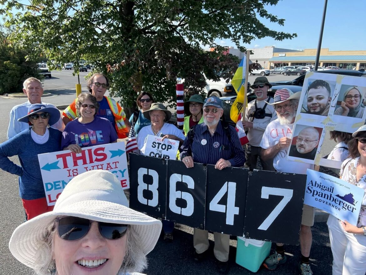 Federal law enforcement has not charged Comey with a crime in this matter. And since then, you’ve seen more and more people holding up signs saying “86 47”. Very recently, a member of the Shenandoah County Democrat Committee – at a local anti Trump rally in Woodstock Va, held up a sign saying “86 47”. What is more concerning is the fact that a group of local Democrats, including Shenandoah County Democrat Chair Brad Skipper posed in a pic with this miscreant. Other people held up signs as well – including one sign that says “This Is What Democracy Looks Like”.